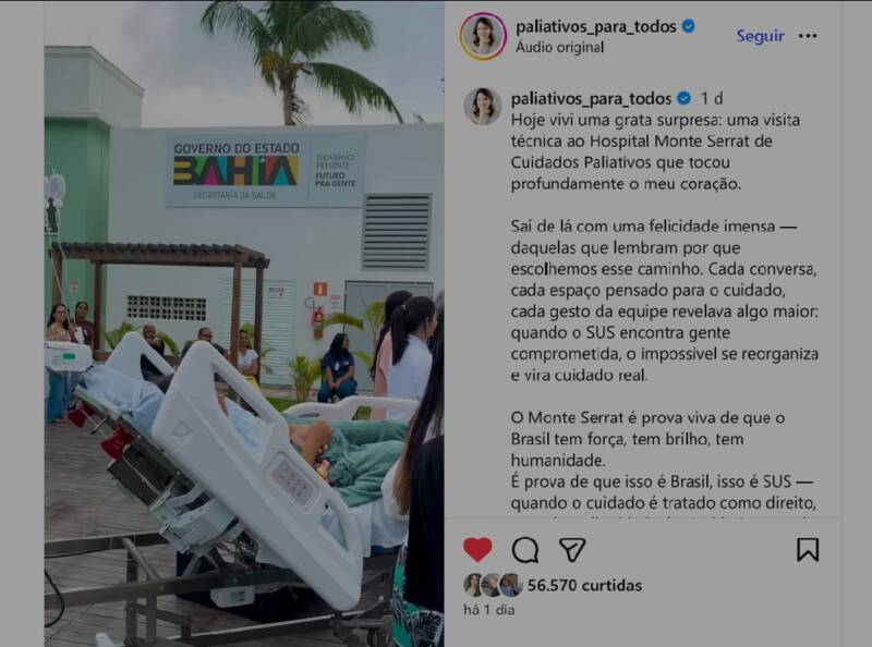 A enfermeira Roberta Antoneli ( @paliativos_para_todos ), especialista em cuidados paliativos, não escondeu sua emoção ao conhecer o Hospital Mont Serrat de Cuidados Paliativos, primeira unidade pública totalmente dedicada aos cuidados paliativos no Brasil. No Instagram, ela escreveu que a iniciativa “tocou profundamente seu coração”. A unidade foi equipada e entregue pelo Governo do Estado da Bahia em janeiro deste ano.