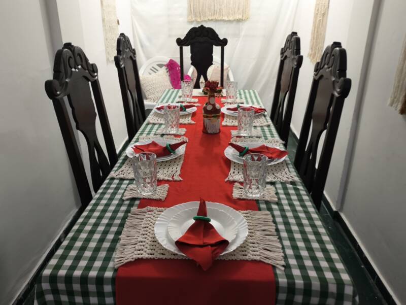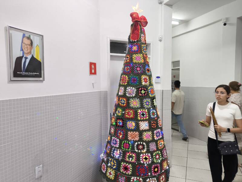 a Árvore de Natal feita totalmente em tricô, delicada, vibrante e construída ponto a ponto por mãos que aprenderam, treinaram e se dedicaram ao longo do ano. Uma obra que conquistou olhares, fotos e elogios.