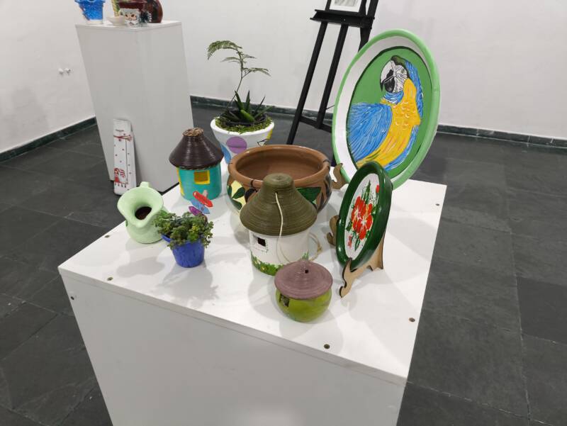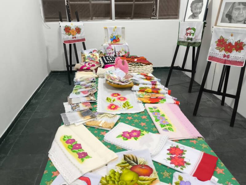 tricô, crochê, pintura decorativa, molduras artesanais, trabalhos em madeira, fibras naturais e pequenas peças artísticas. Tudo feito pelos alunos das oficinas, mostrando que a formação oferecida pela Secretaria transformou habilidade em expressão.