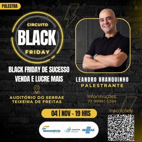 Empresários e empreendedores de Teixeira de Freitas terão a oportunidade de se preparar para uma das datas mais importantes do comércio nacional. No dia 4 de novembro, às 19h, o Sebrae realiza a palestra “Black Friday de Sucesso – Venda e Lucre Mais”, com a presença do renomado especialista em vendas e comportamento do consumidor Leandro Branquinho.