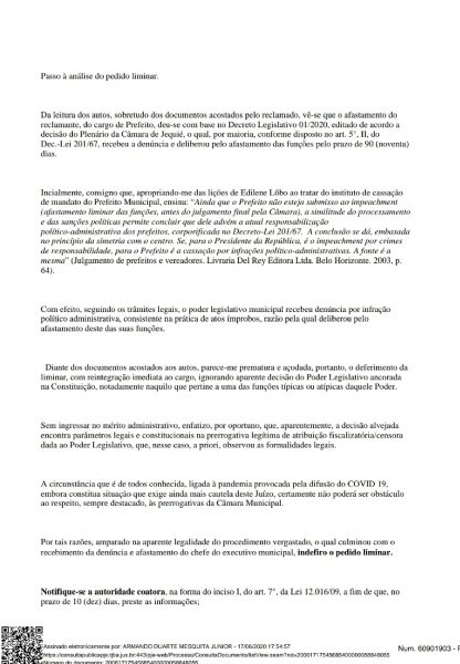 Juiz de Direito Auxiliar da 2ª Vara dos Feitos de Relação de Consumo, Cíveis e Comerciais de Jequié, Armando Duarte Mesquita Júnior, indeferiu Mandado de Segurança com pedido de liminar impetrado na tarde desta quarta-feira (17), pelo prefeito de Jequié, Sérgio da Gameleira, através do advogado André Requião Moura, que considera ato ilegal praticado pelo presidente da Câmara Municipal, Emanuel Campos Silva, que resultou na aprovação do afastamento do cargo, do Chefe do Executivo. Em seu despacho, o magistrado afirma que “Diante dos documentos acostados aos autos, parece-me prematura e açodada, portanto, o deferimento da liminar, com reintegração imediata ao cargo, ignorando aparente decisão do Poder Legislativo ancorada na Constituição, notadamente naquilo que pertine a uma das funções típicas ou atípicas daquele Poder. Sem ingressar no mérito administrativo, enfatizo, por oportuno, que, aparentemente, a decisão alvejada encontra parâmetros legais e constitucionais na prerrogativa legítima de atribuição fiscalizatória/censora dada ao Poder Legislativo, que, nesse caso, a priori, observou as formalidades legais”. Argumenta ainda o Juiz na fundamentação de sua decisão que “a circunstância que é de todos conhecida, ligada à pandemia provocada pela difusão do COVID 19, embora constitua situação que exige ainda mais cautela deste Juízo, certamente não poderá ser obstáculo ao respeito, sempre destacado, às prerrogativas da Câmara Municipal. Por tais razões, amparado na aparente legalidade do procedimento vergastado, o qual culminou com o recebimento da denúncia e afastamento do chefe do executivo municipal, indefiro o pedido liminar”. A partir da decisão, o prefeito poderá recorrer da decisão no Tribunal de Justiça da Bahia-TJ-BA.