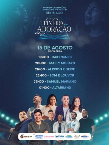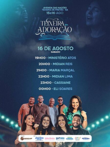 Teixeira de Freitas (BA) – É hoje! O grandioso Teixeira em Adoração começa nesta sexta-feira, 15 de agosto, com duas noites arrebatadoras que prometem sacudir a fé e elevar o espírito. A Avenida das Nações será palco de um verdadeiro tsunami de louvor, reunindo a comunidade evangélica do Extremo Sul da Bahia, Norte do Espírito Santo e Minas Gerais.