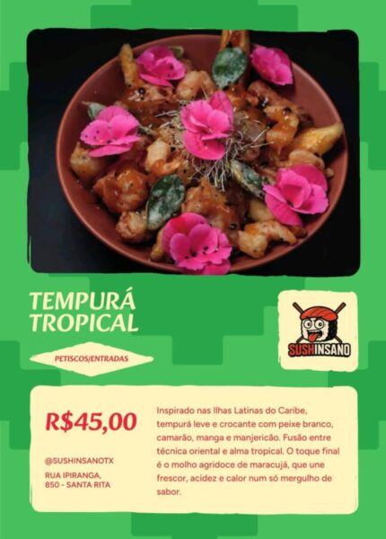 Entre os campeões de público, o Tempurá Tropical do Sushinsano dá show. Inspirado nas ilhas latinas do Caribe, combina peixe branco e camarão em tempurá leve e crocante, abraçados pela doçura da manga, o aroma fresco do manjericão e o molho agridoce de maracujá que sela a experiência com equilíbrio entre acidez e doçura — crocância por fora, suculência por dentro e um perfume tropical que conquista na primeira garfada.